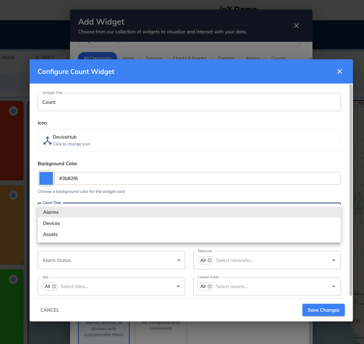 We’ve added a new Count Widget to IoT Dashboards. This widget lets you count records in your system using specific filters. You can customize it and add multiple Count Widgets to a dashboard to track anything from the number of alarming sensors to assets with a particular operating status.